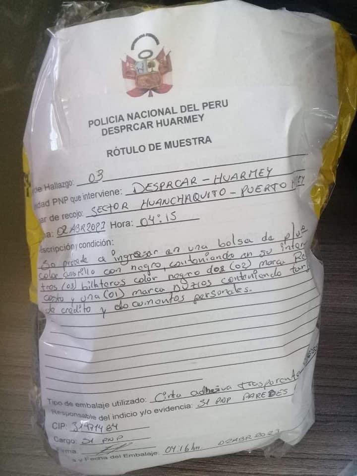 Una vez conocido el hecho se apoyó a la unidad móvil de la DESPRCAR Huarmey con seis (06) efectivos de CPNP Huarmey al mando del SB. PNP cruz León Cirilo Ernesto, donde minutos más tarde en alrededores del Puerto Huarmey en una zona salitrosa y matorrales apartada de la zona urbana, se halló mochilas, tarjetas, celular, Smart Watch, entre otras pertenencias de los pasajeros tiradas en la tierra, procediendo a recogerlos y trasladarlos a la CPNP Huarmey para las diligencias de ley.