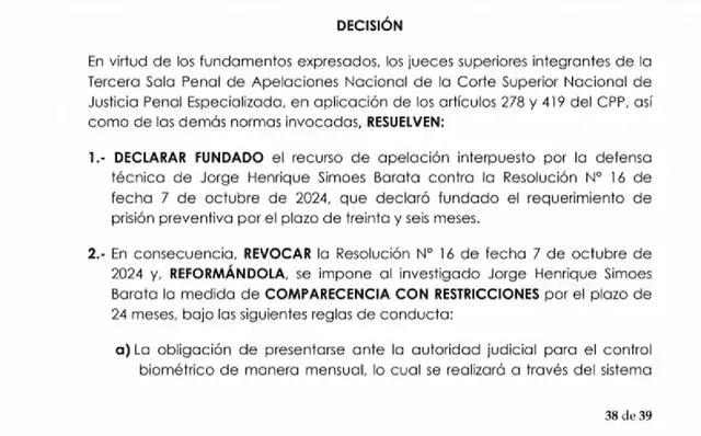 El juez Leodán Cristóbal Ayala dictó la medida coercitiva contra Jorge Simoes Barata ante «la presencia de sospecha fuerte sobre la presunta participación del investigado (…) en los seis actos de presunta colusión agravada en el contexto de los proyectos de inversión pública, conocidos como Proyecto Kuntur y Proyecto Gasoducto».