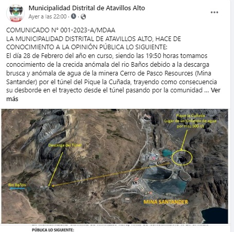 “Por lo que el Concejo Municipal del distrito de Atavillos Alto, en pleno acordó, responsabilizar a la minera Cerro de Pasco Resources (Mina Santander) de todo los posibles daños que pueda ocasionar si no toma medidas preventivas y urgentes para poner a buen recaudo a la población, además hacemos un llamado a la Policía Nacional del Perú y Ministerio Público , para que de oficio inicie las investigaciones frente a este atentado contra el medio ambiente y la integridad de los pobladores de la comunidad afectada, como corresponde; así mismo se solicita el pronunciamiento y opinión especializada de las entidades y órganos competentes en materia ambiental, de salud y de disminución de riesgos y desastres, para la evaluación de daños ocasionados, y el justo resarcimiento por los daños ocasionados a la economía de la comunidad y del distrito e impactos ambientales que afectan la vida y la salud, derecho que nos ampara la Constitución Política y demás marco normativo en materia ambiental y de salud”, concluye el comunicado que fue publicado en la página de Facebook del municipio el día viernes 03 de febrero.