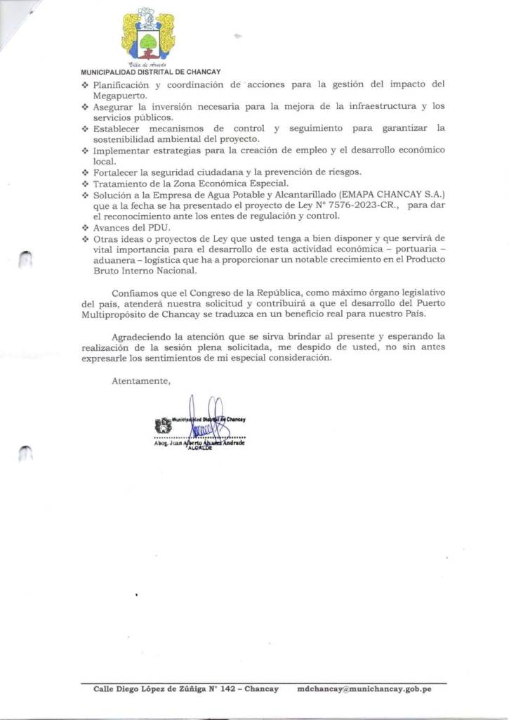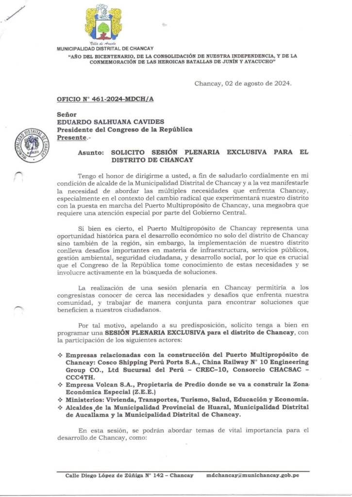 En un esfuerzo por abordar las múltiples necesidades que enfrenta el distrito de Chancay, el alcalde Juan Alvarez Andrade, ha solicitado formalmente al presidente del Congreso de la República, Eduardo Salhuana Cavides, la realización de una sesión plenaria exclusiva en nuestra localidad. Esta solicitud surge en el contexto de la inminente puesta en marcha del Puerto Multipropósito de Chancay, una megaobra que promete transformar la economía de la región.