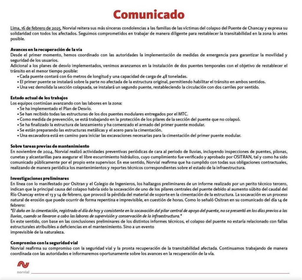 “En nombre de los gremios de Transporte de Carga del Perú, nos dirigimos a ustedes con el propósito de expresar nuestra profunda preocupación por la reciente interrupción del tránsito a la altura del kilómetro 75 de la Panamericana Norte, ocasionada por la caída del puente Chancay. Esta situación ha generado una grave congestión en la mencionada vía, afectando directamente al sector que representamos y ocasionando diversas dificultades “, expresaron.