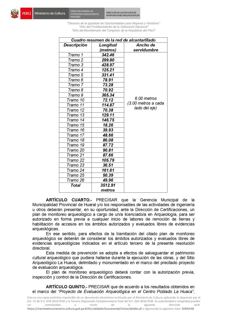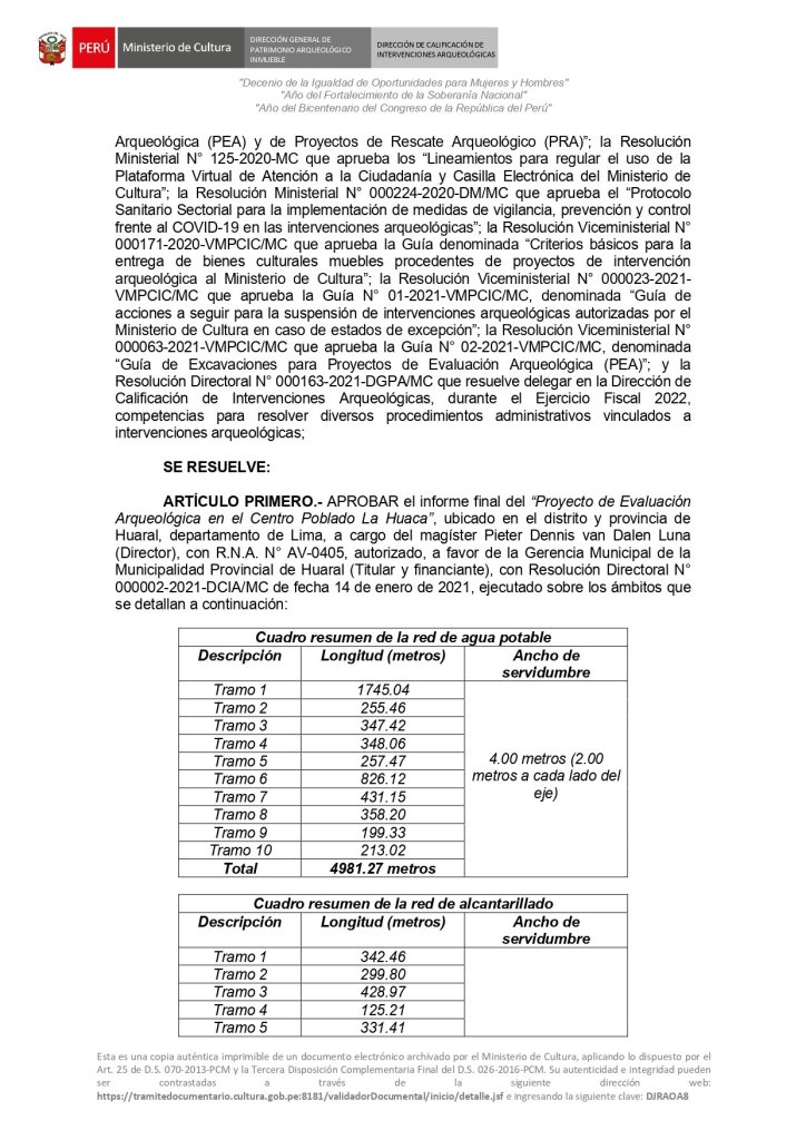 “Quiero comunicarles que por fin el Ministerio de Cultura, el 23.06.2022, emitió la RESOLUCIÓN DIRECTORAL N° 00216-2022-DCIA/MC, mediante el cual se APROBÓ el Informe final del “Proyecto de Evaluación Arqueológica en el Centro Poblado La Huaca”, ubicado en el distrito y provincia de Huaral, departamento de Lima, el cual estuvo a cargo del magister Pieter Dennis Van Dalen Luna, con este documento se establece las áreas libres de evidencias arqueológicas y con el cual se podrá iniciar el proceso de elaboración del expediente técnico del proyecto de agua desagüe, que se encuentra a cargo del Gobierno Regional de Lima”, escribió en su cuenta personal de Facebook.