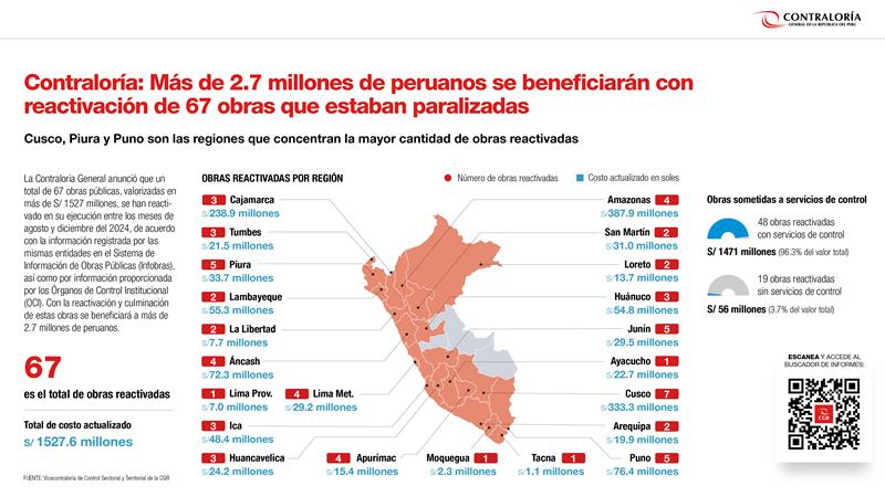 La Contraloría General anunció que 67 obras públicas, valorizadas en más de S/ 1527 millones, se han reactivado en su ejecución entre agosto y diciembre del 2024, de acuerdo con la información registrada por las mismas entidades en el Sistema de Información de Obras Públicas (Infobras) y los Órganos de Control Institucional (OCI), lo que beneficiará a más de 2.7 millones de peruanos.