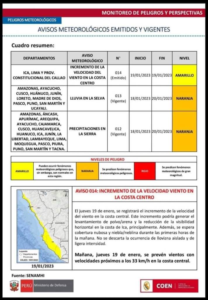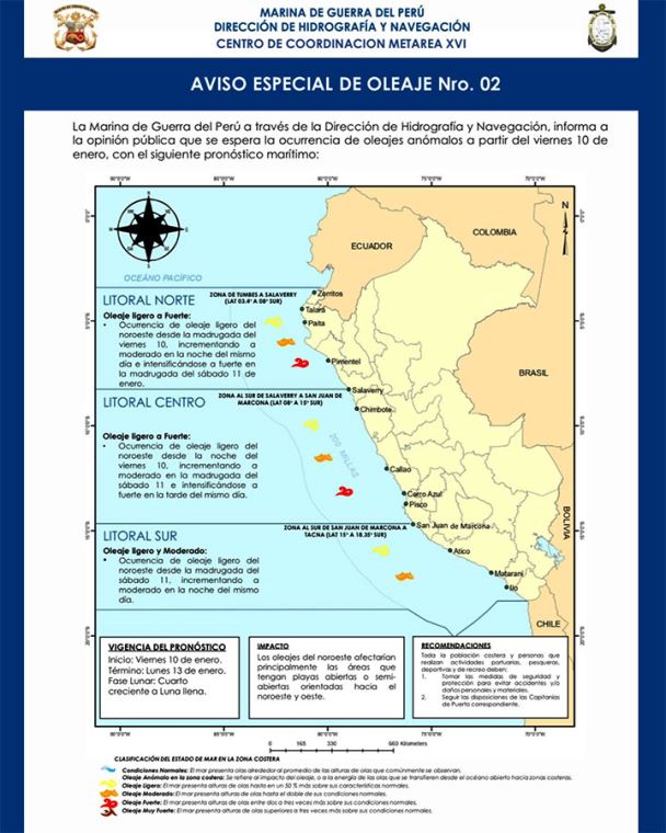 Asimismo, en el centro de la costa, de Salaverry a San Juan de Marcona, se prevé oleaje ligero desde la noche del viernes 10 de enero, llegando a moderado durante la madrugada del sábado 11 de enero y pasando a fuerte por la tarde de dicho día.