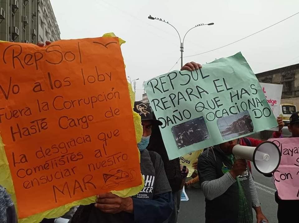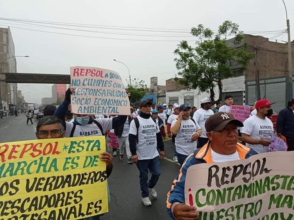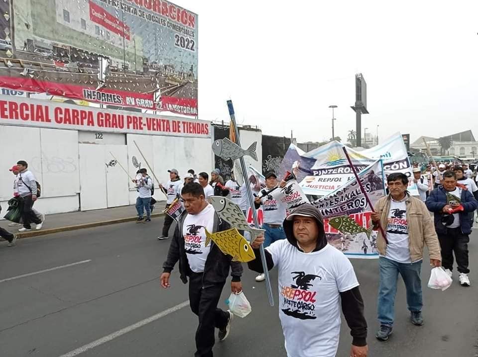 Decenas de pescadores artesanales arrojaron peces negros este martes a las afueras de la empresa española Repsol en Lima, como protesta por la contaminación que causó un derrame de crudo de la petrolera en enero, en las costas de Perú.