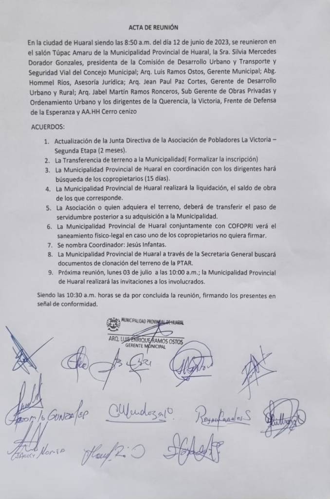 En los acuerdos tomados en la reunión destaca la liquidación que hará la Municipalidad Provincial de Huaral con respecto al saldo de la obra.