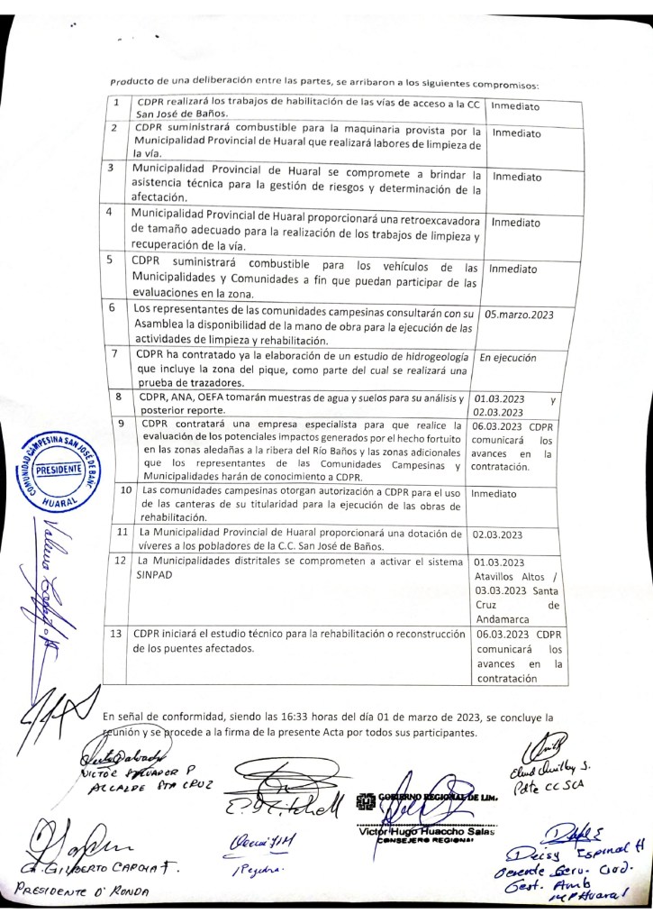 En ese sentido se elaboró Compromisos y Acuerdos por todas las partes, teniendo en cuenta que aún la Comunidad de San José de Baños sigue en inminente peligro ante posibles hechos similares, dado que aún el «Pique La Cuñada» tiene una importante carga de agua como lo reconoce la empresa Minera en su comunicado N° 03-2023/CDPR-SANTANDER