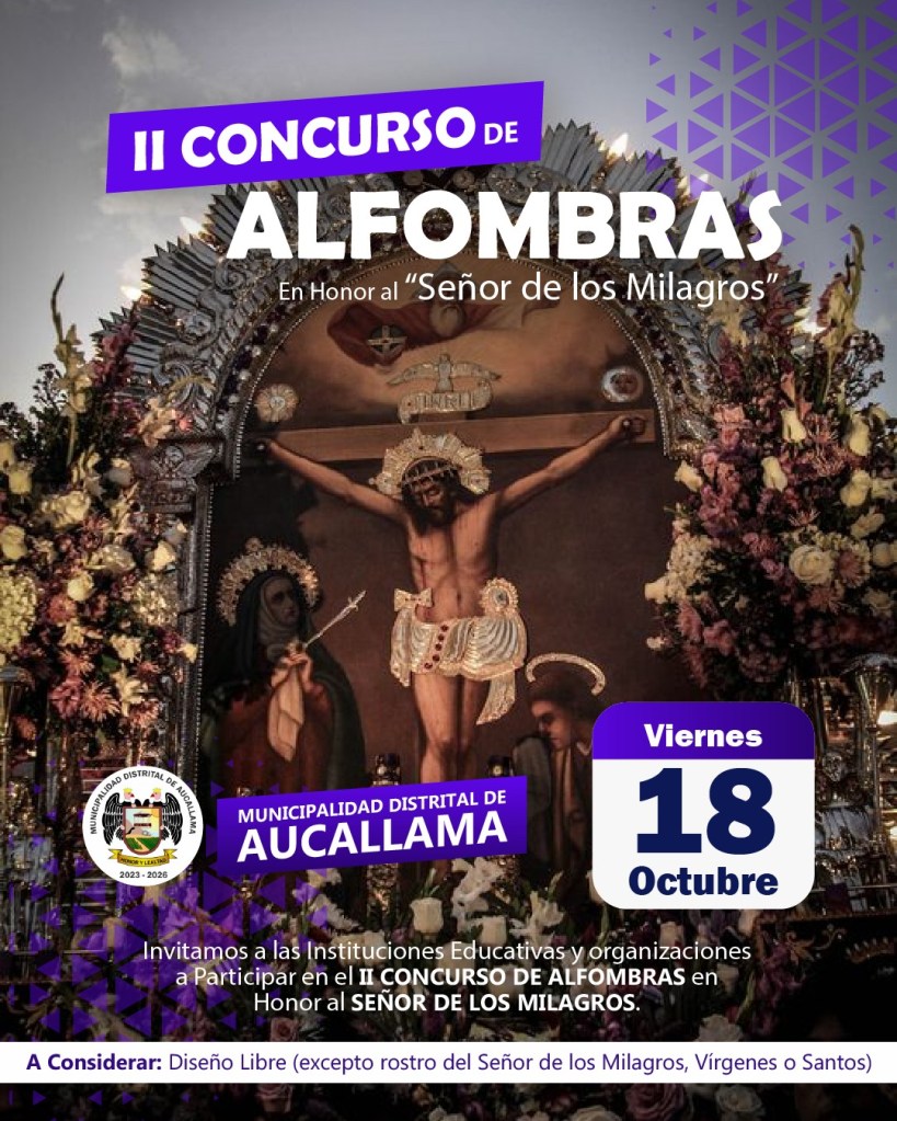 La Municipalidad Distrital de Aucallama viene realizando las coordinaciones y la convocatoria correspondiente a las instituciones educativas de nuestra jurisdicción para la realización del II Concurso de Alfombras en honor al «Señor de los Milagros».