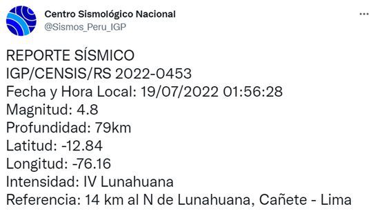 De acuerdo con información del Instituto Geofísico del Perú (IGP), el movimiento sísmico se produjo a las 12:53 p.m.
