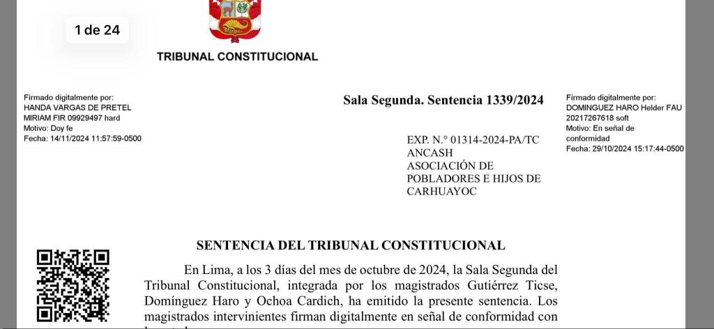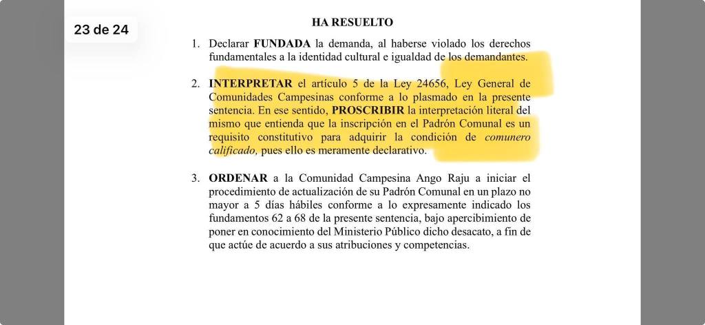 Se trata de una sentencia expedida en el marco de una demanda presentada por una asociación de hijos de una comunidad campesina de Ancash, cerca de la minería Antamina contra una comunidad para que actualicen el padrón comunal.