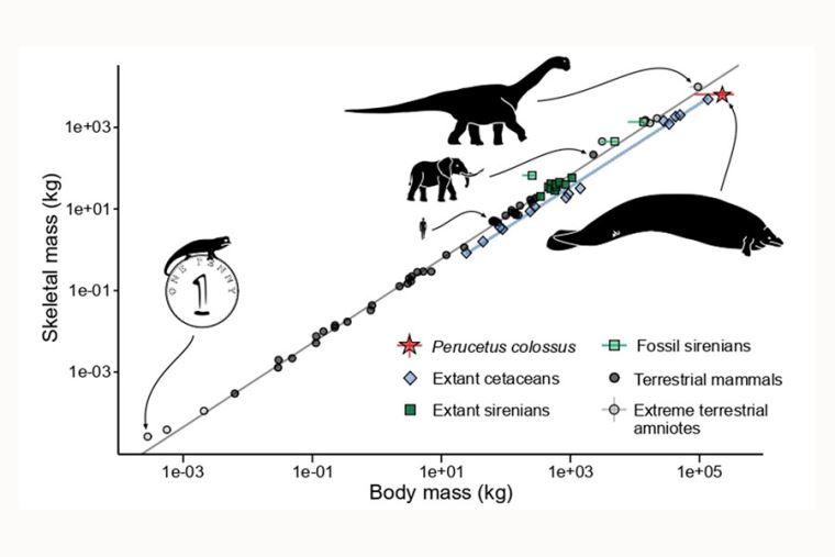 Con esta información y una serie de regresiones computacionales (análisis estadísticos), el equipo estima un peso en vivo del Perucetus colossus con una mínima de 86 toneladas y un máximo de 340, en promedio unas 199 toneladas.